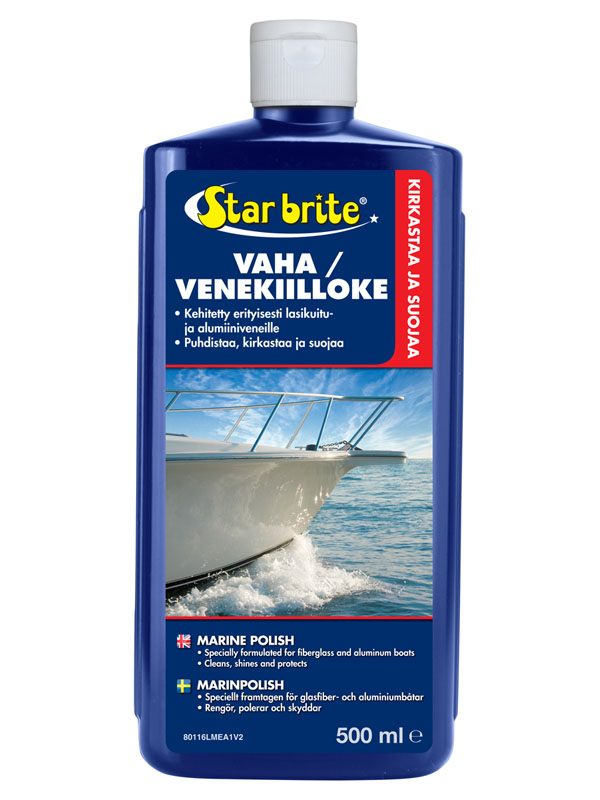 Star brite venekiilloke / vaha on monipuolinen hoitotuote, joka soveltuu lasikuidulle, alumiinille, metallipinnoille sekä maalatuille pinnoille. Se puhdistaa ja kiillottaa pinnan samalla käsittelyllä, jättäen jälkeensä syvän ja kirkkaan kiillon. Tuotetta voidaan käyttää myös suorassa auringonpaisteessa.